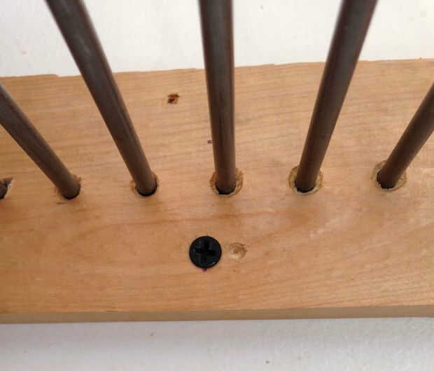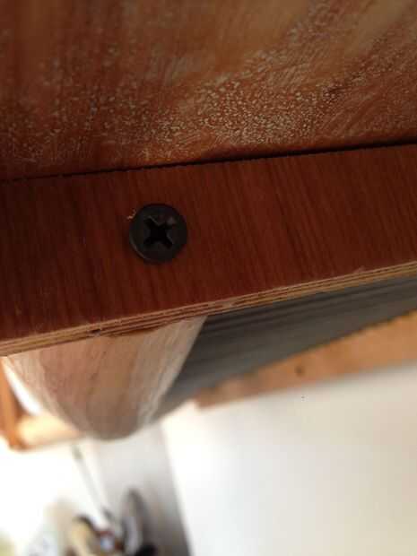 Para el frente puse un tornillo a través de la pared del gabinete en cada extremo de la rama. Taladrar un agujero piloto puede ayudar el tornillo ir y evitar que se resquebraje.