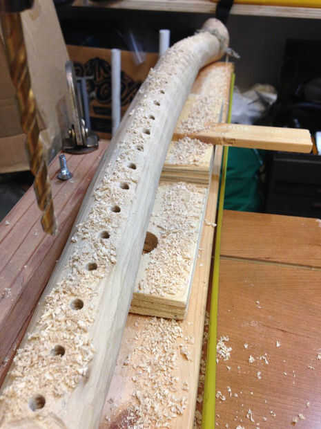 Taladré ~1/2 "agujeros profundos por echando un vistazo el medidor de profundidad en el taladro. Enrolle un pedazo de cinta alrededor de la broca para dejar la parte inferior expuesta de 1/2" habría sido una manera más inteligente a medida. No podía configurar una parada ya que la rama no era plana.