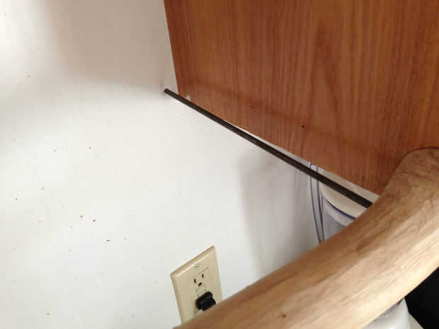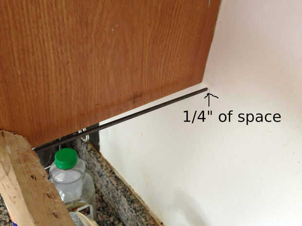 Cortar barras de acero para cada extremo de modo que hubo ~1/4 "de espacio entre ellos y la pared. Planeé perforar agujeros en el tablero trasero casi todo lo largo, dejando sólo 1/8" de madera. Esto daría a las varillas de 1/8" de espacio para deslizar hacia adelante y hacia atrás. Dicho de otro modo, sería necesario cortar las barras para dentro de 1/8" su longitud ideal para que encajen. Esto resultó difícil, así que recomiendo darse más margen de maniobra. El más grueso las piezas de madera se utiliza, mayor puede ser su tolerancia.