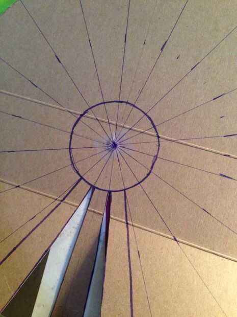 Toma tu transportador y desde el centro del círculo hacer una línea cada 20 grados con el lápiz. Extender las marcas para el centro y los bordes del círculo como en la primera foto.