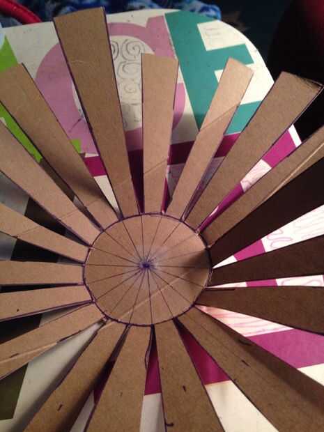 Alrededor de las líneas de lápiz que desea hacer 2 líneas con el rotulador. La longitud de la línea secante (la distancia entre dos líneas de lápiz en el borde del círculo base pequeño); que la longitud necesita constante todo al borde de la cartulina. en el primer cuadro, verá en la parte inferior en sharpie de lo que estoy haciendo. Así que finalmente debe tener lo que ven como rectángulos largo flacos y cuñas finas. Recorte de las cuñas, dejando los rectángulos porque esos son sus espinas para la cesta. Sería como la segunda imagen cuando termines.