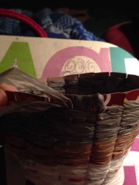 Su cesta debe ser tejida casi todo el camino hasta la parte superior que tal vez un 1/4" izquierdo de cartón visible. Tomar un nuevo bucle y bucle alrededor de un par de pinzas para que actúen como una aguja. Escoger un lugar para comenzar pero no arranca Dónde está el final de su último lazo tejido. Hacer cabeza de alondra sabe de ese lazo. Ir sobre el en el interior de la cesta y las pinzas bajo 2 lazos de hilo. Esto va desde el lazo inferior entonces bajo y fuera del circuito más cercano a la parte superior. Luego repetir lo mismo en el exterior de la canasta.