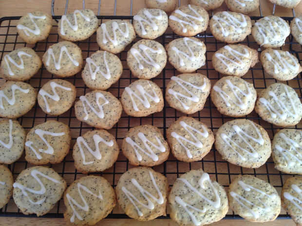 Mezcla de glaseado de azúcar y jugo de limón, verter en la Manga pastelera o bolsa de ziplock y glasear galletas refrigeradas