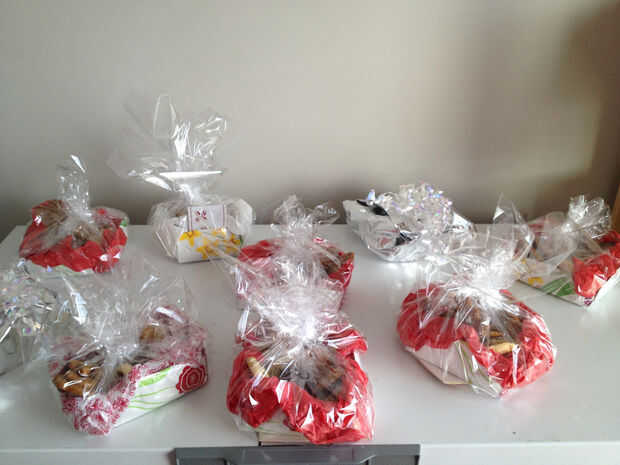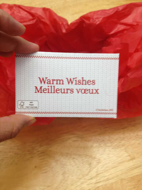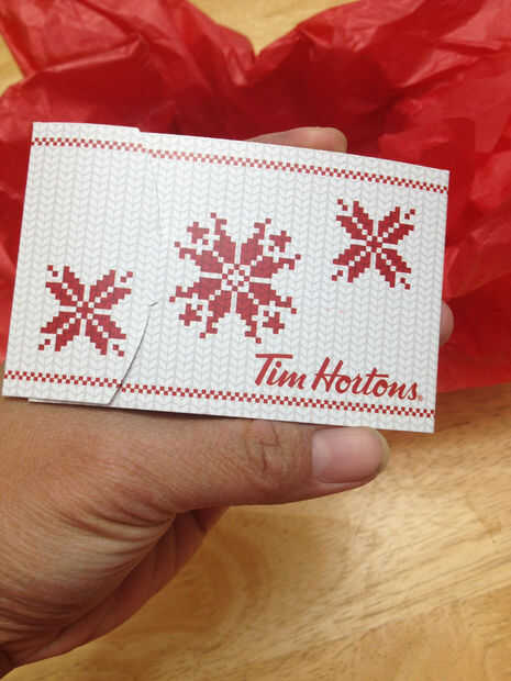 Lugar papel de seda en color rojo, verde y la caja de galletas son tan festivas para esta temporada. Organizar muy bien sus cookies y ocultar una pequeña tarjeta de Navidad si no tarjeta de regalo para una sorpresa (yo uso Tim Horton para el café o cualquier destinatario quiere conseguir) y envolver con celofán.
