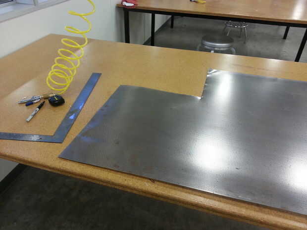 Las dimensiones finales de mis bandejas no crítico así que decidí cortar la porción conveniente, rectangular, de un proyecto anterior y maquetar todo ese material. Corte mi material de trabajo utilizando un cortante, pero esto podría también se han realizado con tijeras de mano, aunque es un poco más tedioso. Tenga cuidado de no cortarse. Metal de hoja puede ser engañosamente fuerte en su estado original.