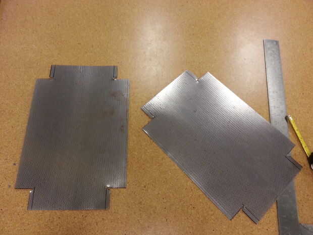 Una vez que la plantilla se ha cortado a la medida, es hora de empezar a doblar. Iniciado por formando un dobladillo (o doblado sobre la porción) en los bordes externos de las plantillas. Estos bordes pronto formarán la parte superior de las bandejas de metal, así que es importante hacer algo que mitiga los bordes agudos del metal hoja crudo en estas áreas. Un dobladillo es una solución simple que se puede alcanzar rápidamente y mejora la apariencia del producto terminado.