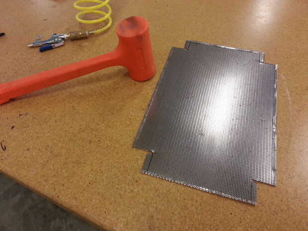 Las curvas se comenzaron a usar el freno del dedo (llamado así porque tiene dedos de metal extraíbles; no porque se rompe los dedos) y luego he utilizado un martillo de golpe muerto para terminar el trabajo, hacer los dobladillos agradable y plana.