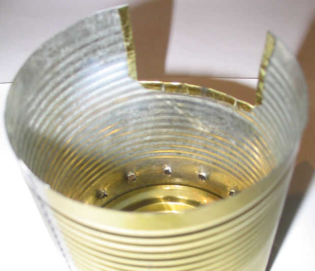 Crear un anillo de agujeros de aire en la parte superior de la olla. Son vitales, permitir que el aire fluya hacia arriba a través de la olla. Para hacer los agujeros simplemente perforar la lata con el pincho, teniendo cuidado de no para apuñalar a sí mismo, deje una separación de 1/2" entre cada agujero.