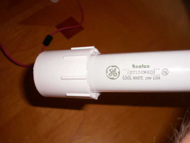 Para hacer estos tubos de pie, necesitamos apoyo de algún tipo. Resulta que nuestros omnipresentes tuberías de PVC tiene collares que funcionan muy bien para este propósito. Encontrar conector de tubería de 1.5 pulgadas, con un extremo de un ajuste deslizante y el otro roscado. Los tubos fluorescentes encajan perfectamente en la parte roscada. Ahora serán soporte de las bombillas de 24 pulgadas.