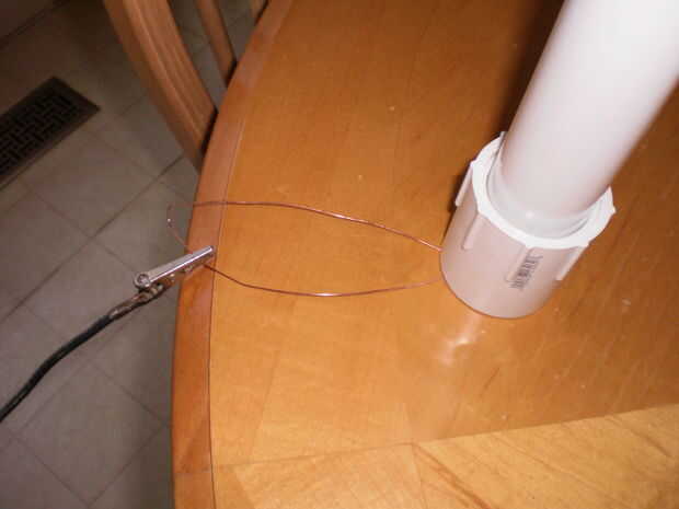 En un conector de PVC, perfore un orificio de 6/32 cerca del final de ajuste deslizante. Adjunto un corto perno de cobre amarillo 6/32 y tuerca. Ejecute un pedazo corto de alambre de calibre 18 campana de conectores de tubo de luz al perno 6/32. Apriete la tuerca para fijar el cable. Ahora, en la parte exterior del perno, clip en una longitud de cable a tierra. Este puede ser cualquier alambre de cobre ordinario, correr fuera de la casa y conectado a una varilla de tierra. (Usar una longitud de tubería de acero galvanizada en el suelo fuera de la ventana de mi cocina. Corro unos 6 pies de 10 medidor de cable a la varilla de tierra de la casa. El cable tiene pinzas en ambos extremos. Un clip va en el perno 6/32, el otro agarra la varilla de tierra).