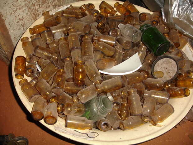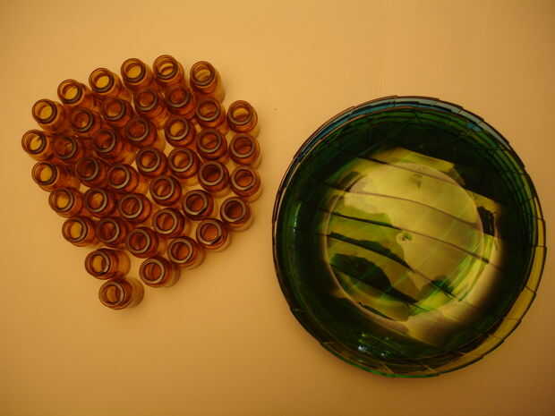 encontré una vieja trucha catcher y descartados poco botellas en el sótano de mis tías. También encontré las placas de plexiglás no deseados que son azul y verde. Vidrio y plexiglás difusión luz muy bien.