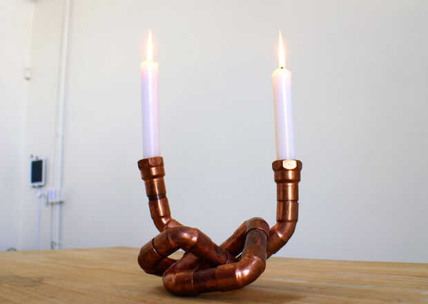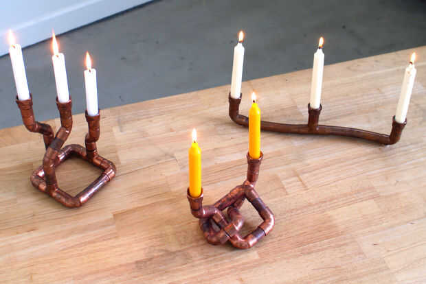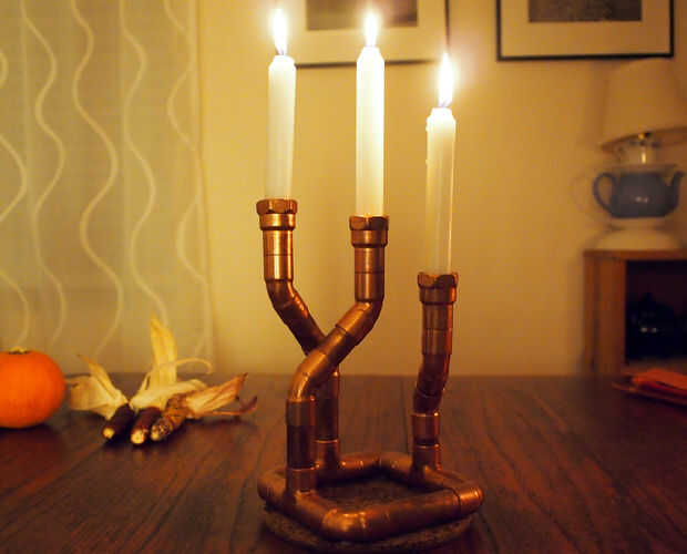 Vimos algunos candelabros hechos de tubo de cobre en una tienda. Eran muy bonitos pero eran caros. Mi papá dijo fácilmente podríamos hacerlos nosotros mismos y que nos mostraría cómo a. Así que fuimos y compró algunas cañerías de cobre e hicimos algu