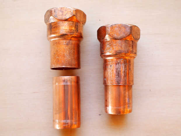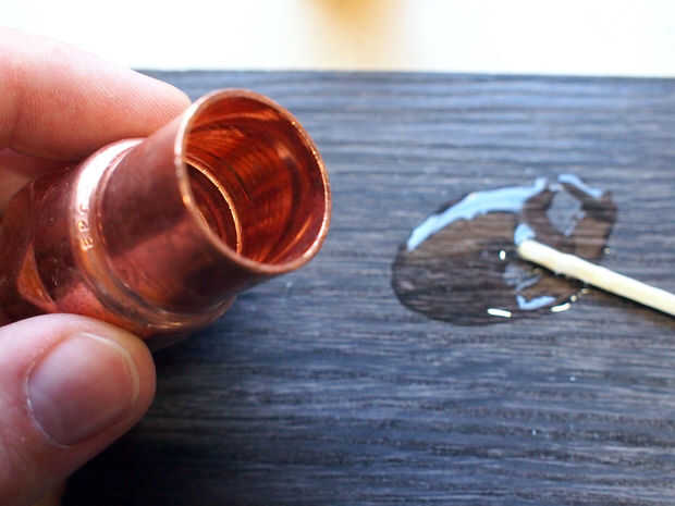 Empecé con las conexiones que yo sabía que sería fácil. En este diseño era el sostenedor de vela para el codo de 90°. Mezclar el epoxi en 2 partes en un pedazo de madera un pequeño lenguado se aplicó para el interior del conector de codo y el interior de los portavelas estriados. Después, los cortes de cobre collar fue insertado anteriormente y las dos piezas se apartar dejó la curación epoxi. El mismo proceso se aplicó a todas las otras conexiones que podrían realizarse en la primera etapa.