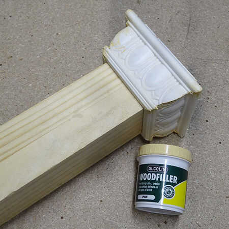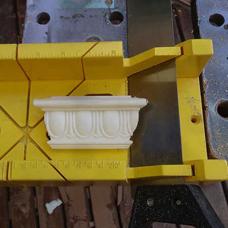 1. cortar el pino. La moldura se corta en ángulos de 45 grados utilizando una caja de ingletes de la oposición. Corte bastantes secciones se ajuste alrededor de la tapa y la base de los rodales de pino.
