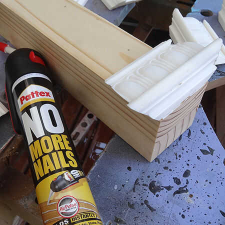 2. Utilice No más clavos pegamento para fijar la moldura en los rodales de pino. Trabajo frente y detrás y dejar que este seco antes de hacer los lados.