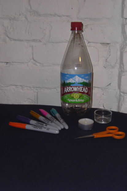 2 limpio utilizado claro botellas de refresco de plástico con una base de compartimentado Lapiceros Sharpie de que colores quieres tu proyecto para ser Luz del té Vidrio sostenedor ligero del té Tijeras Pegamento de Elmer (o cualquier otro pegamento que desee) (opcional)
