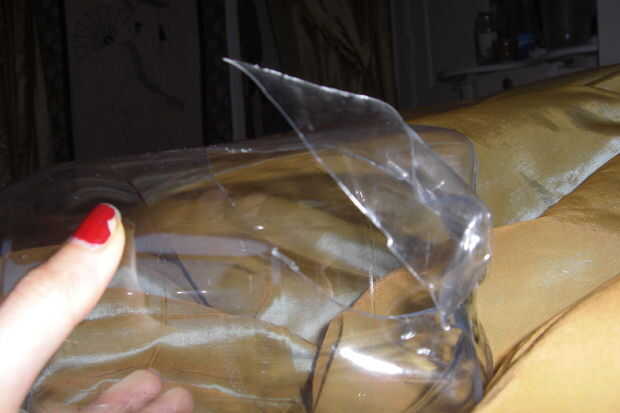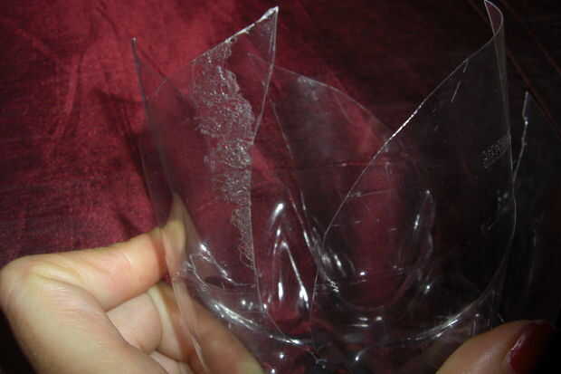 La segunda botella se corta desde la parte central sin base ni tapa. Cada capa se consigue intercalado uno encima del otro para convertirse en capas contrastantes de las vidrieras
