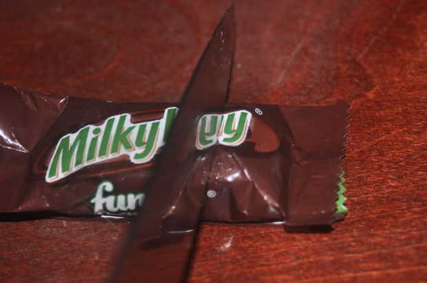 En tercer lugar, usted tiene que cortar la barra de caramelo. Elegir usar un cuchillo de cocina, porque quería comer los epílogos de candy, y por lo tanto es el cuchillo más limpio alrededor. Un Consejo que encontré útil es poner la barra de chocolate en la nevera un rato antes de empezar a cortarlo. Para el corte, asegúrese de que hay suficiente espacio para ambas partes de la unidad flash USB.