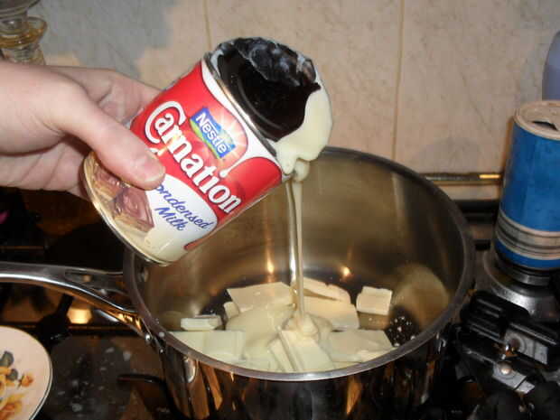 Generalmente derretiría mi sepperatly primer chocolate, pero fue casi 2:00, y sólo quería irse a la cama... No te preocupes con este caramelo no es * realmente * trata, lo mejor, vierte en la lata de leche condensada y cocinar a fuego lento el chocolate en este dulce de leche... Una vez que el Chocolate haya derretido toma la mezcla fuera del fuego... como leche condensada tiene montón de azúcar, y se puede quemar