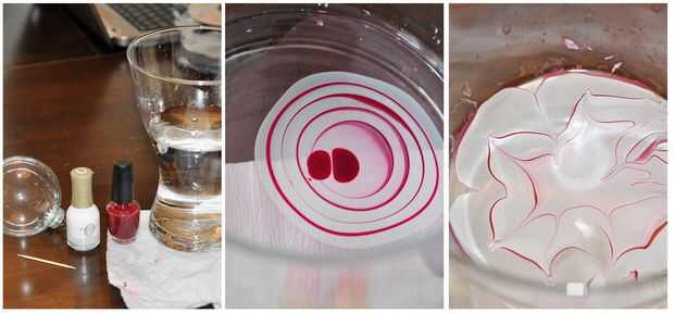 5. goteo el otro color en el agua y mantenga alternando. (Es aceptable si la punta del cepillo del clavo toque el agua, pero es mejor si usted puede conseguir un pegote grande a escurrir la varita y caen sobre la superficie del agua).