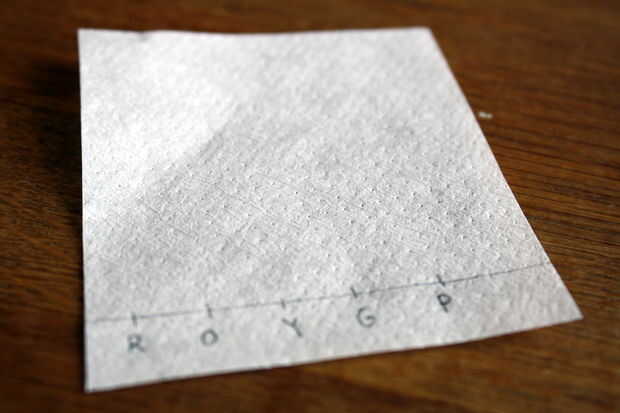 Corte una pulgada aproximadamente 3 x 3 pulgadas cuadrado fuera de un filtro de café. Sobre una media pulgada desde la parte inferior, dibuja una línea a lápiz y luego 5 (o sin embargo muchos colores son pruebas) pequeños puntos equidistantes a lo largo de la línea. Debajo, etiqueta de color que irá en cada punto.