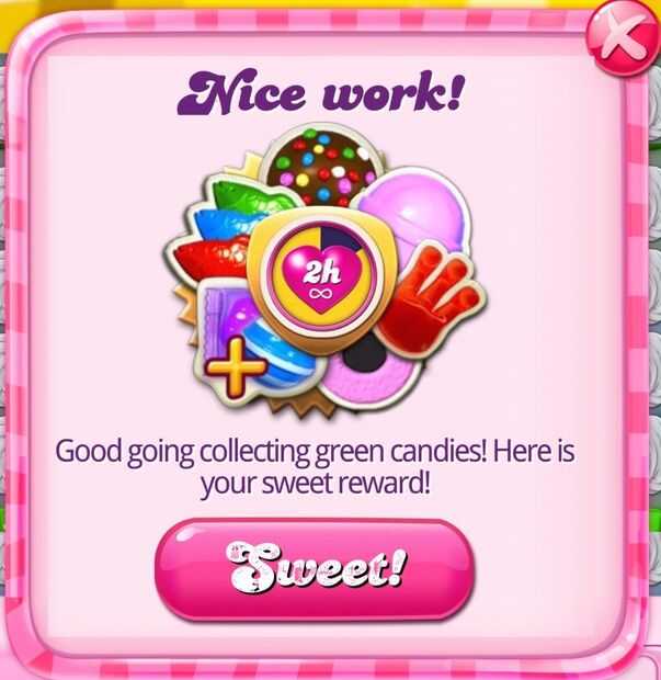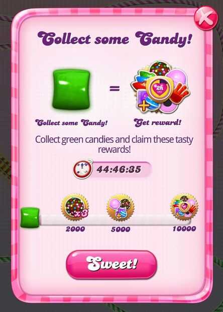 Tal reto es el reto para recoger caramelos varios mil de un color especificado. Podías jugar nivel tras nivel después de siguiente nivel que establece la ruta de acceso al juego con la esperanza de recoger 10.000 caramelos verdes dentro de las 45 horas asignadas, o solo podría volver a un nivel que sólo reparte ese color.