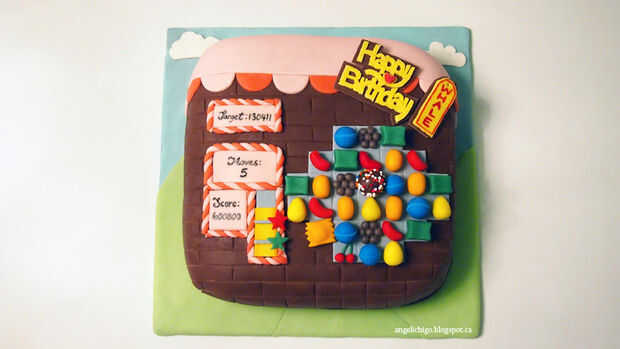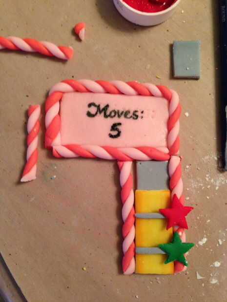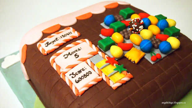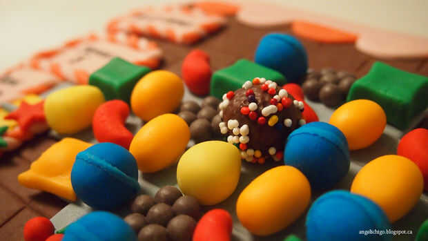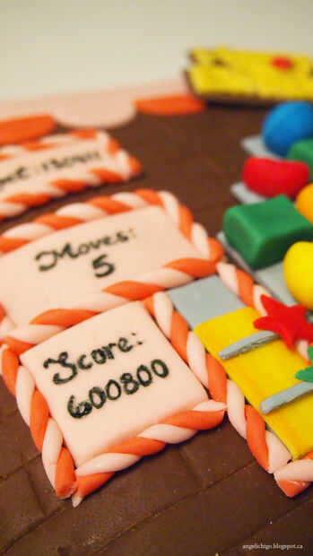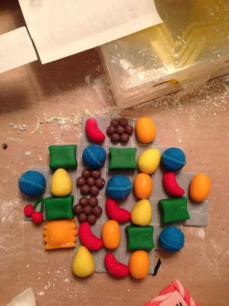 Hice mi propio fondant de malvaviscos y color teñido les utilizando geles de color. Yo en forma de piezas individuales en las diferentes formas de caramelos como se ve en el juego.