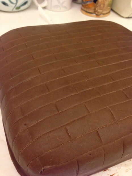 Hecho mi crema y aplicar mi fondant en la parte superior. Utilizado un cuchillo para marcar ligeramente las líneas de ladrillo para asemejarse al fondo y también el tablero de la torta para emparejar el tema.