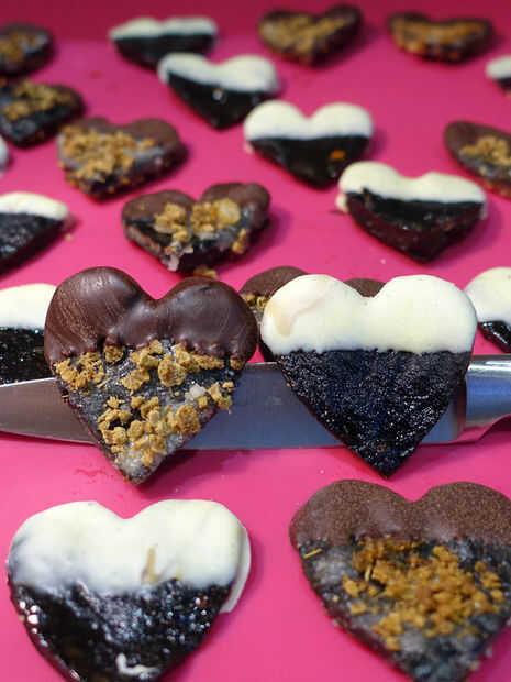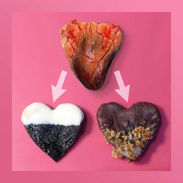 Confecciones cardiacas para su agolpamiento carnívoro! Corazón de buey dulce para su novia querida! Bombones bovinas masacrados por su amado!