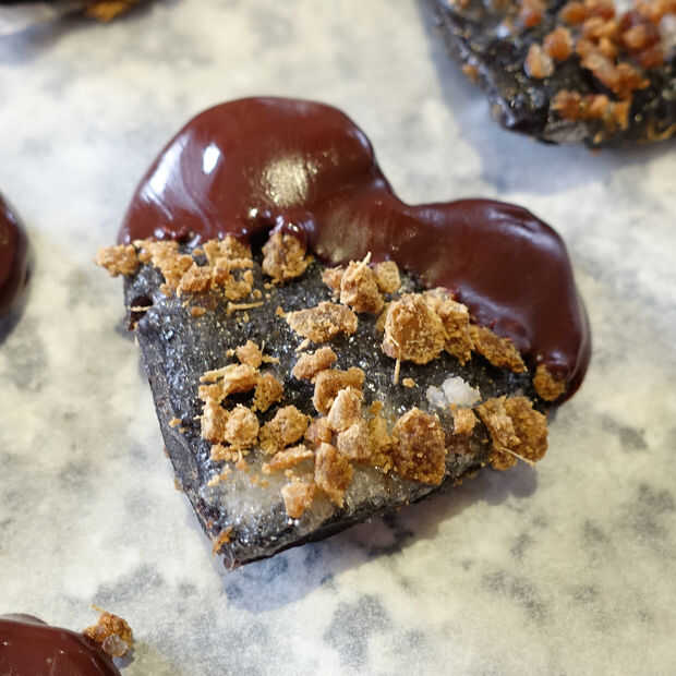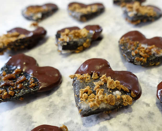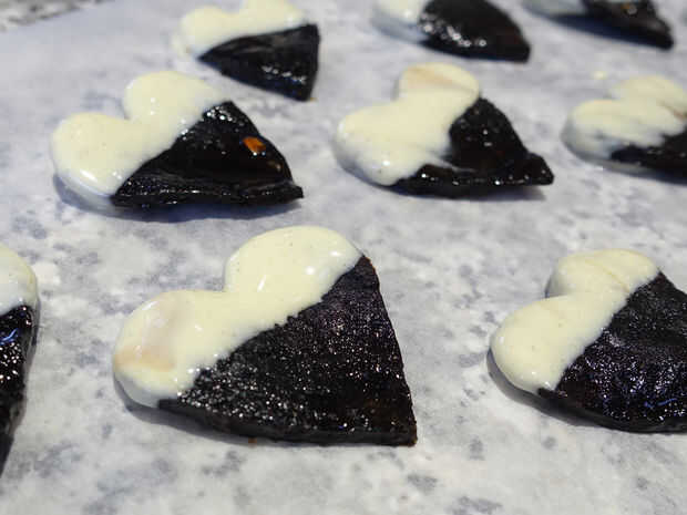 Sumergir los extremos undipped de vuestro corazón en el chocolate y dejar enfriar (en pergamino para hornear o papel de horno) para una última vez.