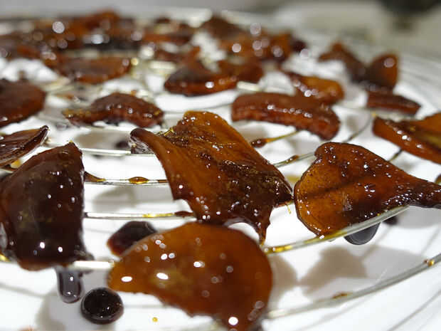 Déjelo enfriar por diez minutos, luego utilice pinzas para recoger los pedazos de jengibre y colocar en una rejilla de alambre. Ten cuidado: lo que está por debajo de la repisa de alambre conseguirá muy pegajosa!