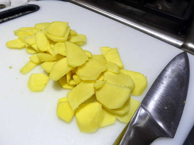Cortar el jengibre en discos finos, ponerlos en una olla y añadir suficiente agua para cubrir completamente el jengibre. Llevar la olla a ebullición y dejar cocer a fuego lento durante diez minutos. Drenar el agua caliente (mmm... té de jengibre...), añadir más agua fría, llevar a ebullición y cocer a fuego lento por diez minutos o hasta que el jengibre ha todos se volvió flexible y ligeramente translúcido.