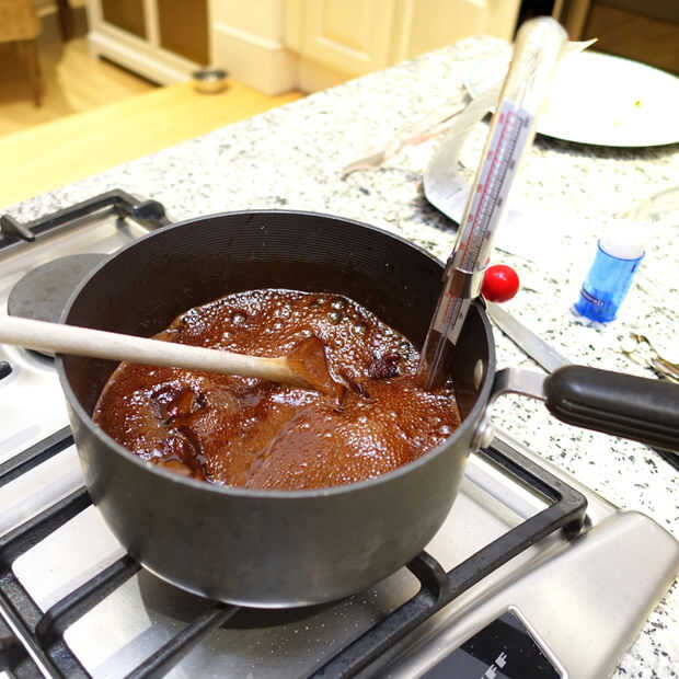 En una olla fresca, agregue 1 taza del agua de jengibre en 1 taza de azúcar. (No se preocupe si usted no utiliza suficiente agua, sólo recargar con agua del grifo.) Utilizando un termómetro de caramelo para comprobar la temperatura, el calor la solución de azúcar a 225° F (107° C), luego retire del fuego.