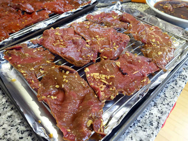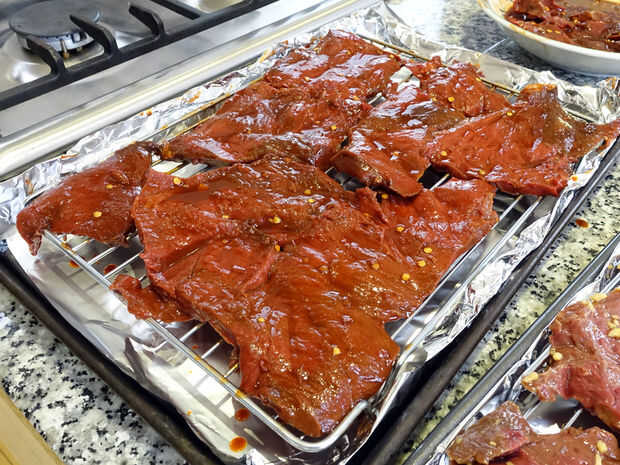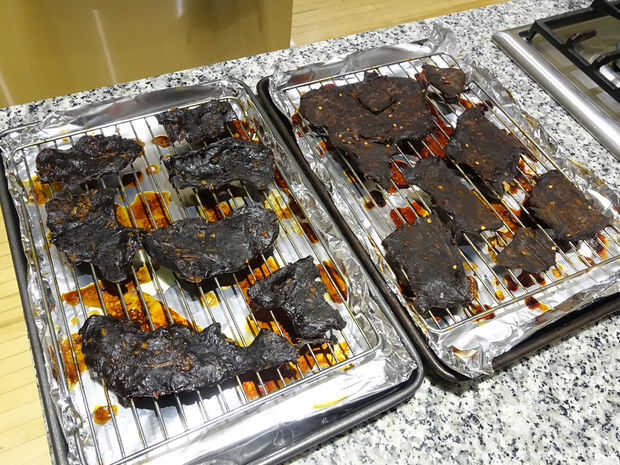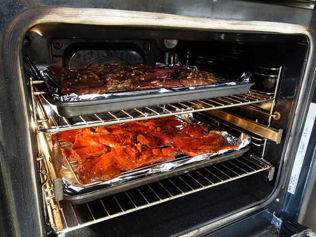Extienda las tiras de carne en una rejilla sobre una bandeja forrada de papel de aluminio, manteniendo separados los dos sabores. Dejarlos en el horno a 190° F (88° C) durante unas 6 horas, o hasta que esté satisfecho con lo duros han convertido en. Suponiendo que no va a almacenar estos durante mucho tiempo (como puede ser con saltos regulares), puede permitir a permanecer un poco squishier que lo haría para Cecina de zapato de cuero de estilo tradicional.
