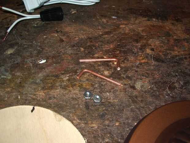 Usted necesitará un disco de madera contrachapada que cabe en la tapa de la lámpara de techo. Y necesita dos tornillos en forma de L (Foto 3). Hice mis propio tornillos doblando una varilla de cobre de diámetro 1/8 pulgadas y roscado el extremo largo de rosca 6-32. Usted también necesitará un par de tuercas para atornillar en los tornillos en forma de L.