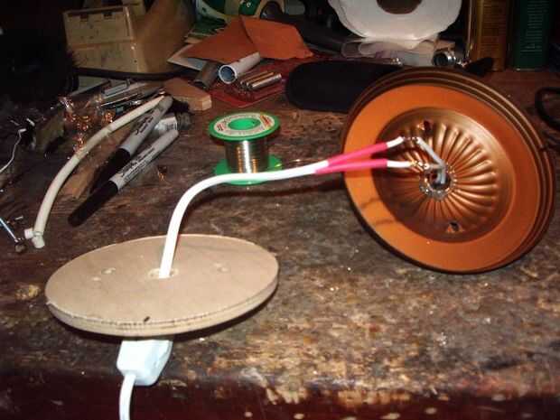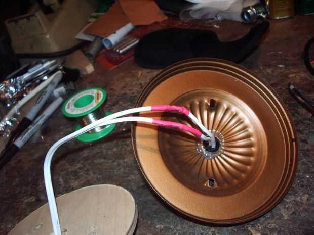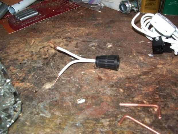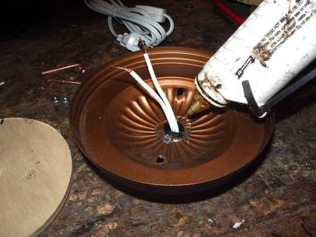 A continuación, pasa el cable de la lámpara mediante el disco de madera y soldar los cables detrás juntos y aislados las conexiones con tubería del encogimiento del calor (fotos 3 y 4).