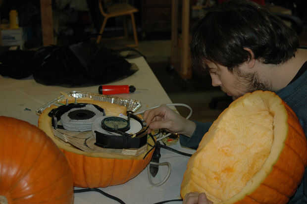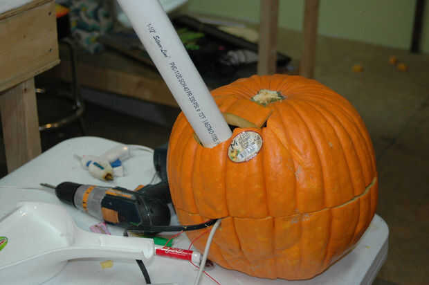 Si la calabaza es el tamaño correcto debe ser capaz de cortar la parte de atrás de él en lugar de la parte superior y deslícelo en. Como se puede ver con la nuestra tenemos que cortarla por la mitad para caber en. Tenga cuidado al cortar la boca que el dulce se podrá salir de ella.