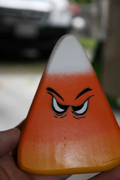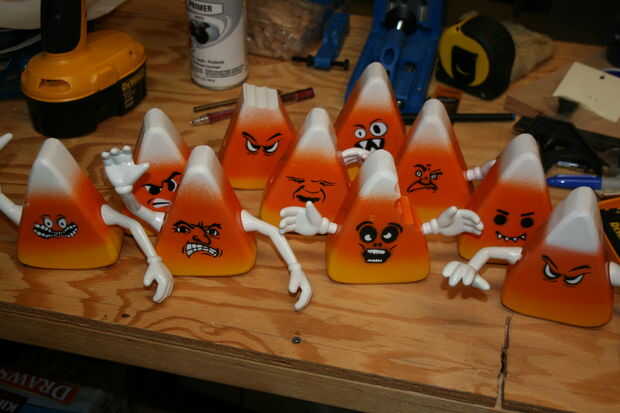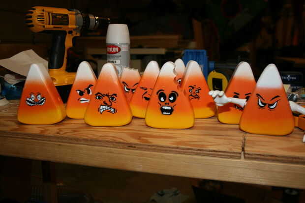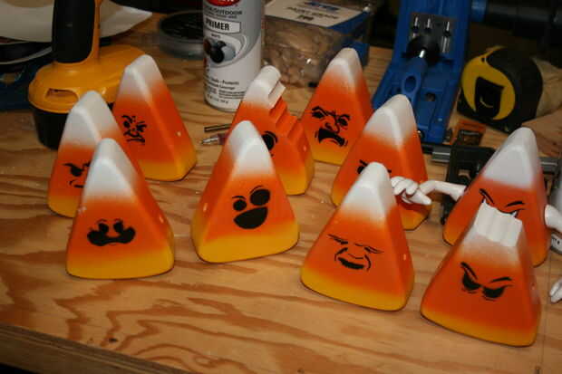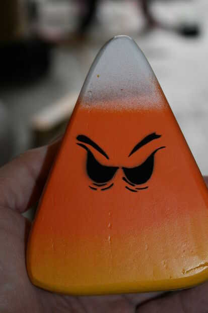 Otra ventaja de la pintura Montana oro es que usted puede comprar diferentes boquillas para las latas. Vienen con una boquilla de uso general, pero comprar boquillas "finos" para este proyecto (un miserable $0,39 cada). Todavía tienes que rociar muy cerca del material para evitar acumulación excesiva, pero funciona mucho mejor que un spray típico puede boquilla. Considera cubriendo las rayas que una división limpia entre los colores, pero si nos fijamos en un maíz de caramelo real, los colores se mezclan un poco, así que para que coincida con la que rociaron los colores sin cualquier enmascaramiento. Tomó un par de intentos para obtener el método abajo a la derecha, pero una vez que la distancia de pulverización óptima averiguada, resultaron gran. Maíz de caramelo no son perfectos, por lo que su pintura no necesita ser.