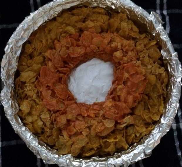Repita los pasos con el 2 º grupo de capas de ingredientes, presione uniformemente la mezcla naranja en anillo de 1 1/2 pulgadas dentro del anillo amarillo en la bandeja de la torta.