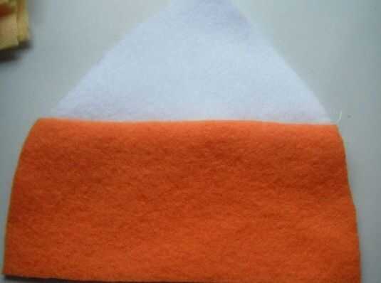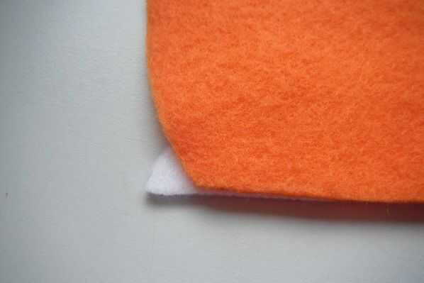 Poner los lados del derecho juntos del blanco y naranja. Usted a coser estas a lo largo de la parte superior de la naranja y la parte inferior de la blanco. Si se les cortan a la derecha debe se alinearon por lo que es como un triángulo de altura.