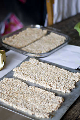 Usando una espátula mantequilla o papel de cera uniformemente Presione la mezcla en moldes para galletas cubierta con spray de cocina. Funciona mejor si la mezcla es sólo alrededor de 1/2 pulgada de espesor. Enfriar.