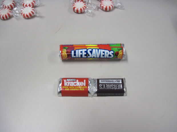 Juntar a miniaturas de Hershey 2 extremos y poner una gota del pegamento hacia abajo de la costura.