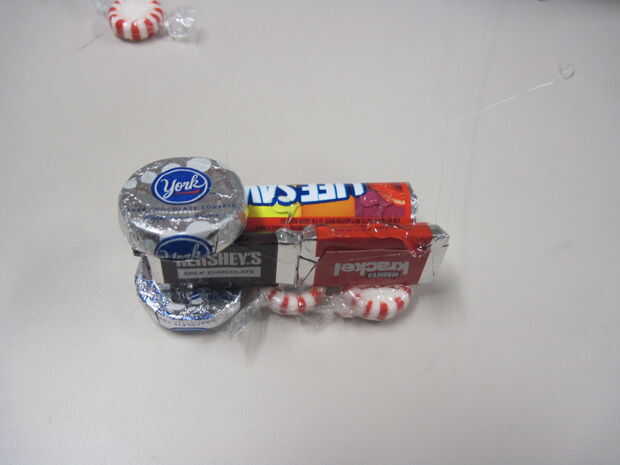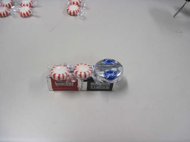 -Poner una capa de media pulgada de pegamento en el borde de la miniatura de Hershey y lado del rollo de salvavidas para cada remolino de menta, uso una pulgada del pegamento de la Patty de menta (se puede ver lo que estoy hablando en los cuadros 2 y 3 de este paso)