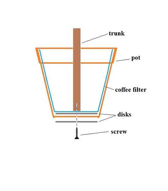 Siguiendo el diagrama de vista lateral, emparedado un disco, olla, segundo disco, filtro de café y el pasador de juntos. Puede optar por dejar el filtro, haga un agujero en la parte inferior de la misma y deslícelo sobre el tronco luego si lo desea.