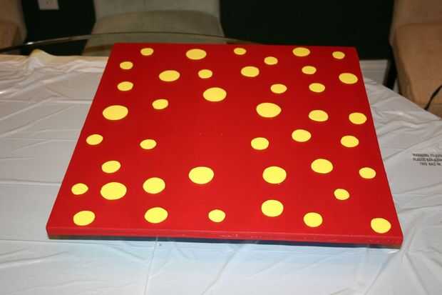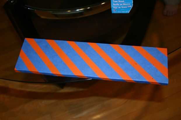 Tomar un 4 "x 15" x 1/2 pulgada de madera contrachapada y pintura naranja. Enrolle diagonalmente cinta de pintor para hacer las rayas.