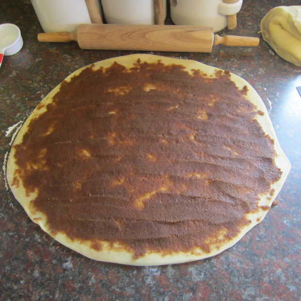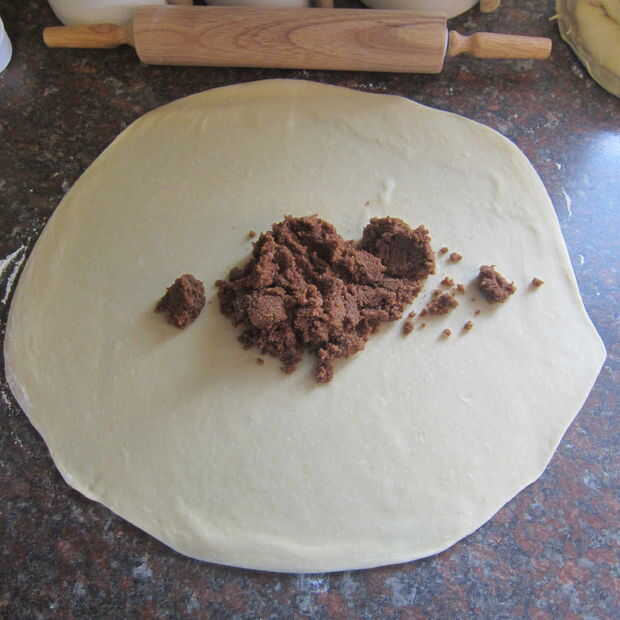 Extender la mitad de la mezcla de relleno uniformemente sobre la superficie de la masa.