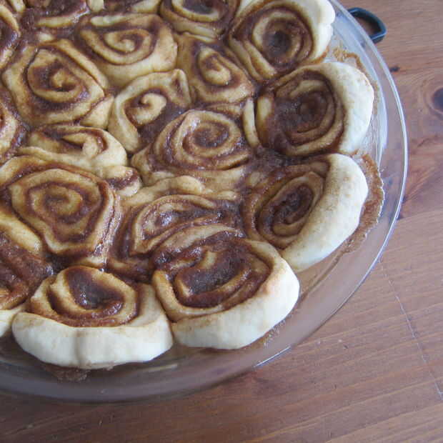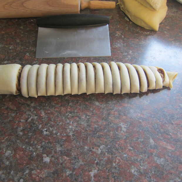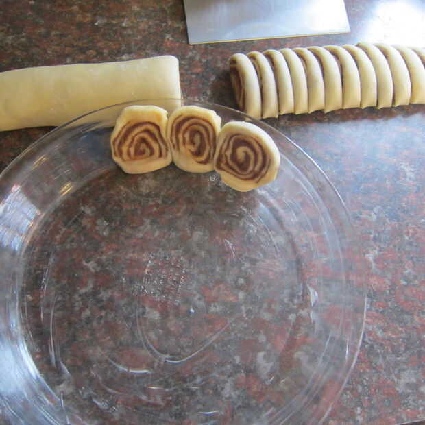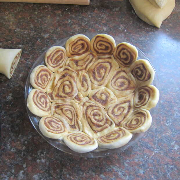 Rollos de canela fina de la prensa en una tartera con mantequilla asegurándose de que todas las costuras y las brechas se cierran.