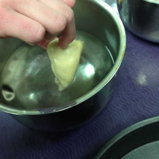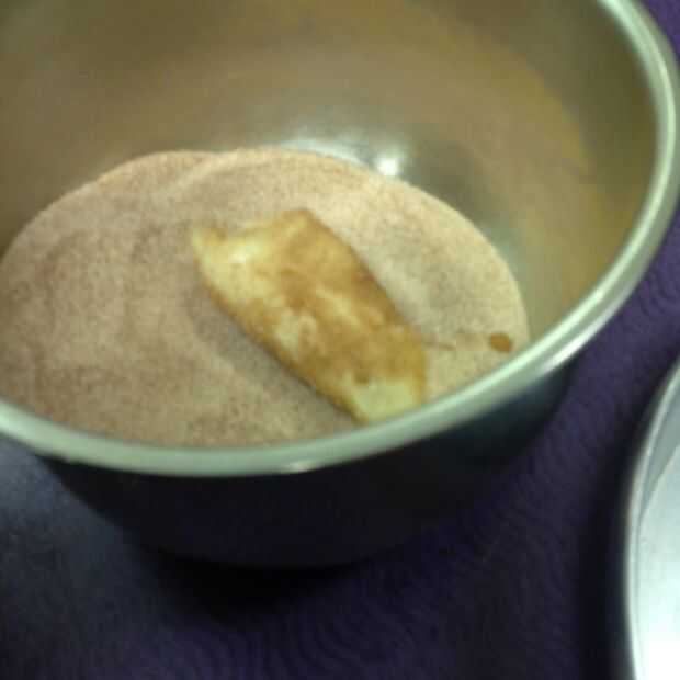 8 pulgada redondo pan de pastel de grasa. Sumergir cada trozo de masa en agua y rodillo en la canela y el azúcar que formuló.