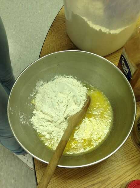 Agregue dos tazas de la harina a la mezcla, revolver para mezclar.