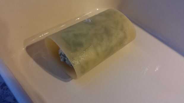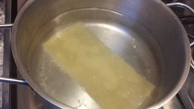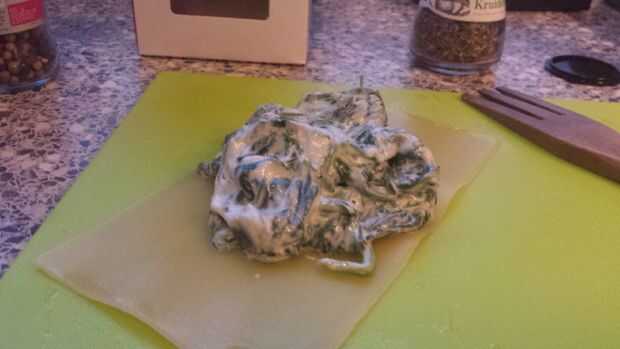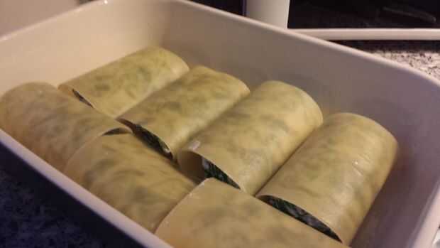 Ahora un recipiente de agua y hacerlo hervir. Agregar una hoja de lasaña a la vez y hervir hasta que es plegable. Toma unos minutos. Haz la mezcla horripilante de ricotta-espinacas. Coloque la hoja de lasaña en una superficie plana. Poner algunas cosas de icky ricotta-espinacas en el centro y ruede para arriba. Poner en una fuente para horno y repita hasta que el plato esté completo. Añadir la salsa de cerdo sangriento muerto y proceder al siguiente paso.